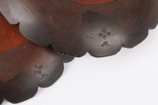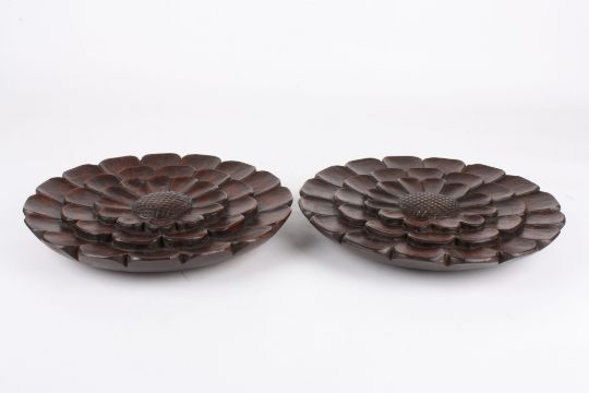 A pair of carved treen chrysanthemum flower head roundels stamped with a bird and four acorns, 25 cm diameter.Condition: Both in good condition.