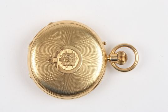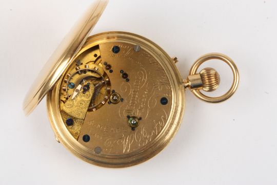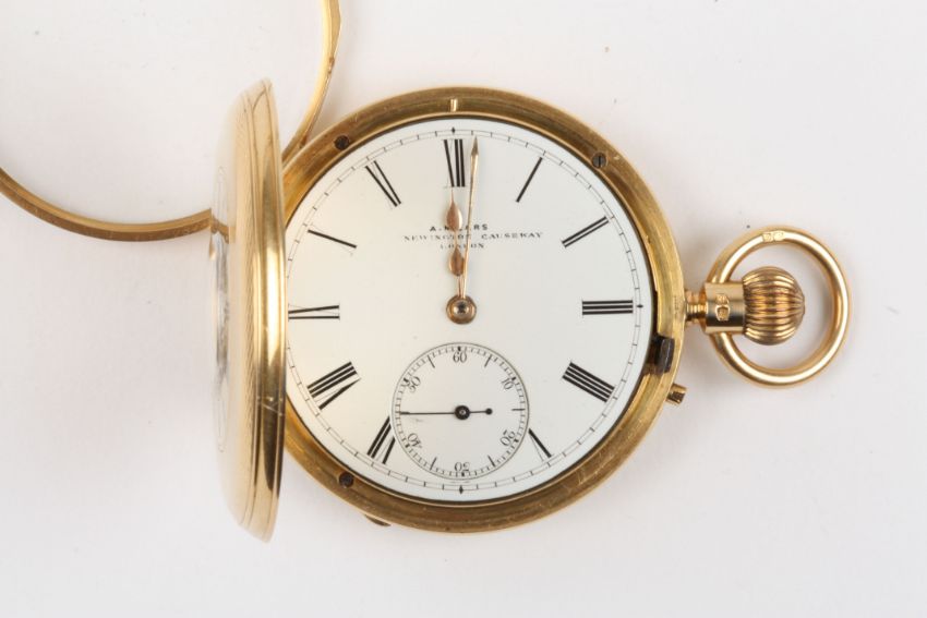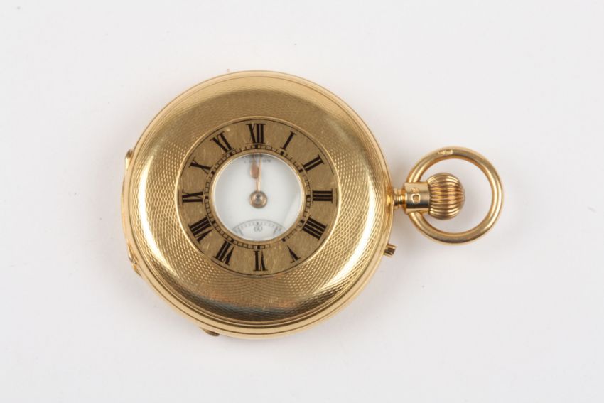 A Victorian 18ct gold half hunter pocket watch by Alonso Mears hallmarked London 1882, windowed cover with black enamel Roman numerals, the white enamel dial signed, with black Roman numerals and subsidiary seconds dial, the engraved three quarter plate signed with makers name and numbered 1884, freesprung with diamond endstone. The engine turned case with engraved monogrammed cartouche. Case maker: Richard James Oliver, 49 mm case diameter. 113.1 grams.Condition: Appears in good working order.