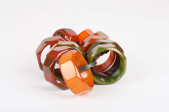 A collection of ten coloured bakelite napkin rings, Condition: Generally good condition with no damage.