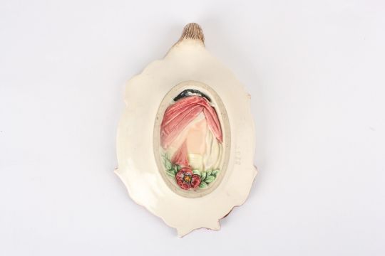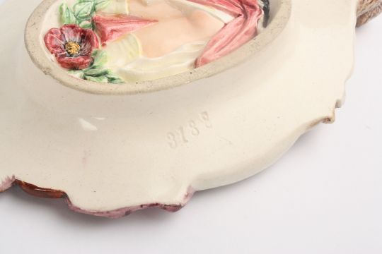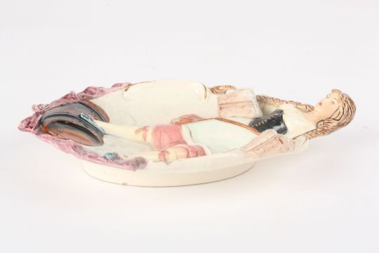 A Continental erotic soap dish moulded as a barmaid with foaming jugs of ale, the reverse side showing a risqué scene of the girls behind. Model number 3188, 20 cm long.Condition: Chip to the rim.