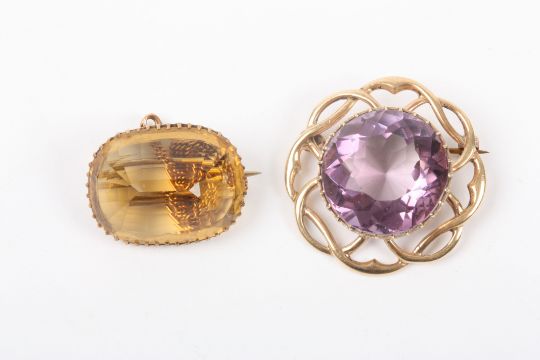 A 9ct gold and amethyst coloured stone brooch together with a yellow metal and citrine brooch. (2), Condition: No damage.