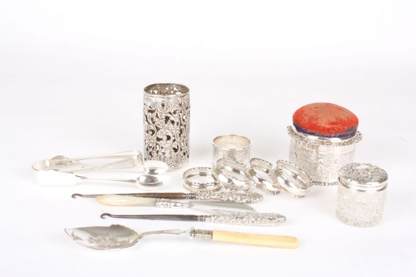 A collection of assorted embossed silver items including a Victorian silver box and cover, napkin rings, dressing table jar, spill vase holder, sugar nips and other items, Approximately 7.5 ozt weighable silver.Condition: Box with some damage, spill vase with splits, other items generally good condition.
