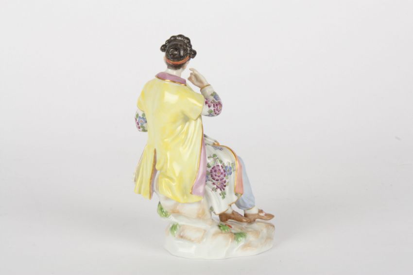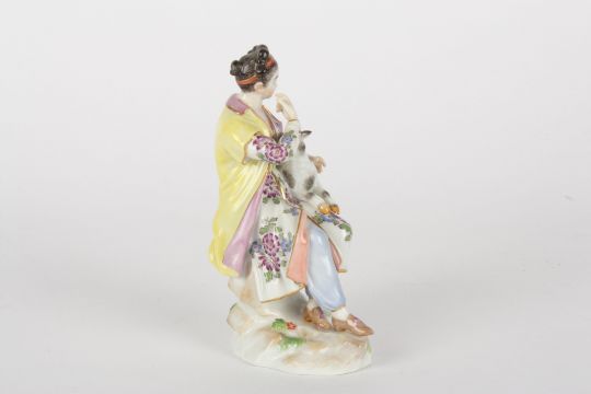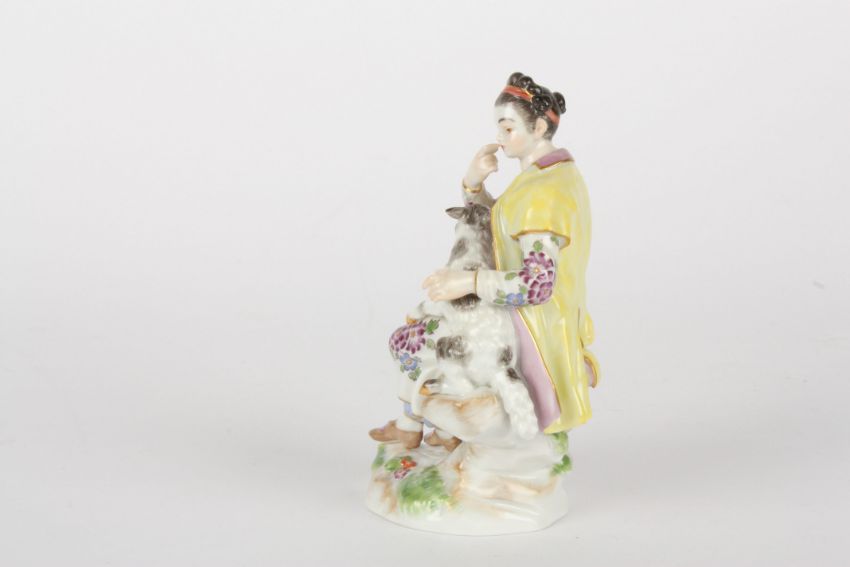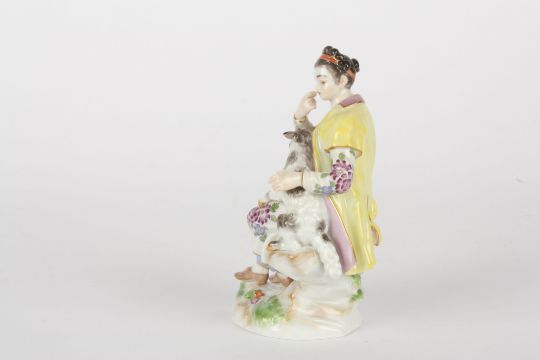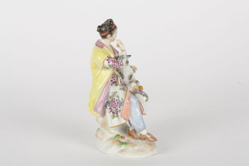 Late 20th century Meissen figure after Elias Meyer, modelled lady seated holding a lamb, painted blue cross swords mark, impressed and incised numerals 86k and 65663, 13.5 cms highCondition: Good condition