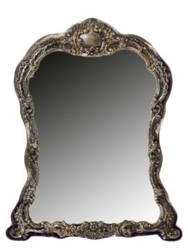 A Victorian silver mounted easel mirror hallmarked Birmingham 1899, ornately embossed with scrolls and flowers,with vacant cartouche, with bevelled plate glass, on a blue velvet base, makers mark Henry Matthews, 44 cm high.Condition: Numerous small holes from ware, signs of old solder repairs, tarnished.