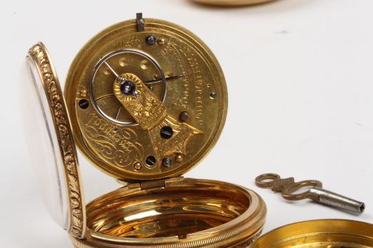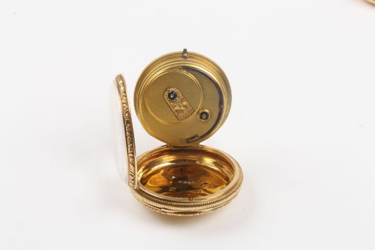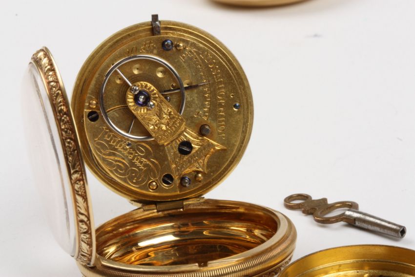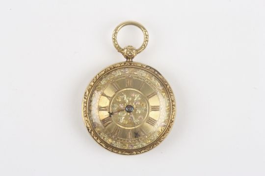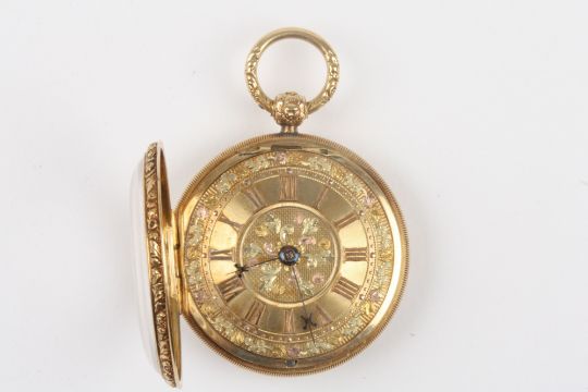 An early 19th century 18ct gold open face pocket watch by John Johnson the gilt engine turned dial with gilt Roman numerals and applied coloured gold scrolls, the full back plate engraved 'John Johnson Liverpool, No. 4808'. American hallmark, fusee movement, with Massey 3 lever escapement, diamond endstone. Case maker: Frederick Rapp & Co. The case with engine turned decoration and engraved foliate rim, 45 mm case diameter, 92.3 grams.Condition: Appears in good working order.
