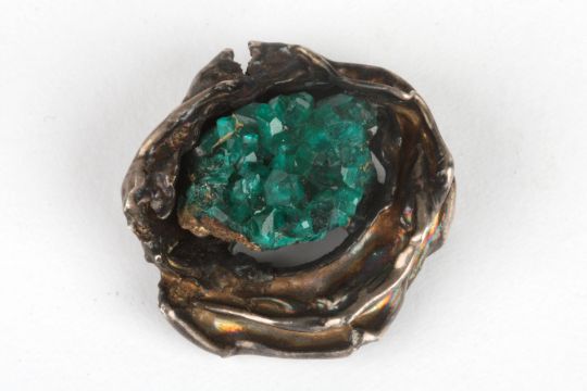 An unusual natural emerald crystal brooch set in a naturalistic white metal mount, 3.5 cm wide.Condition: No damage.