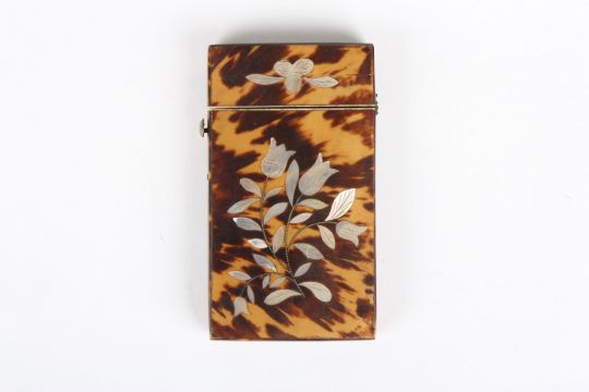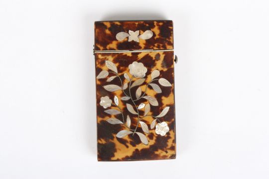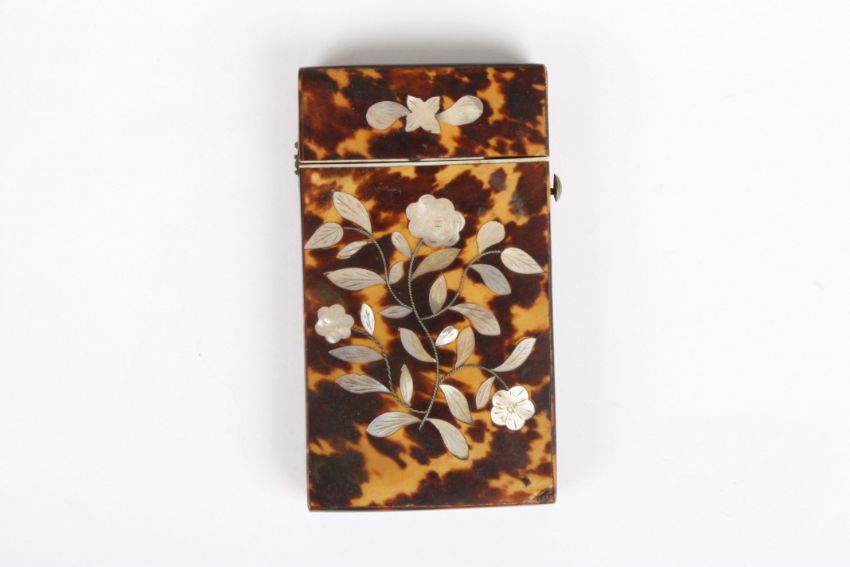 A Victorian tortoiseshell calling card case inlaid with mother of pearl flowers on both sides, 9 x 5 cm.Condition: Lacking metel insert on lid, otherwise no damage.