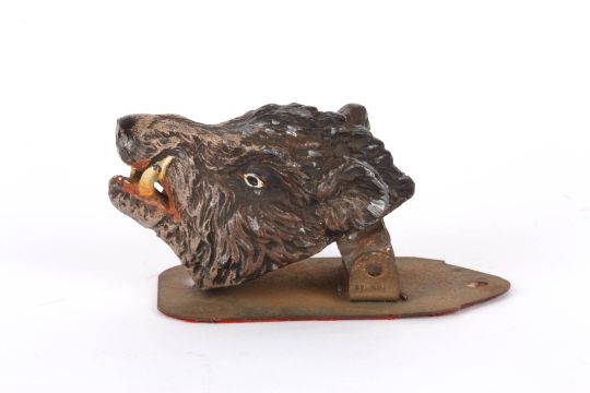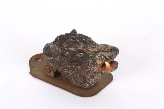 A 19th century painted spelter boars head paper clip mounted on a shield shaped metal bracket, length 9cmCondition: In worn condition and with signs of original paint
