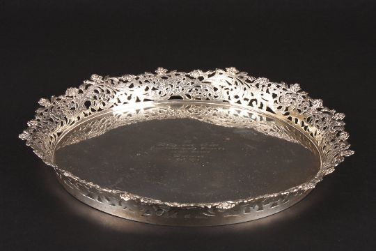 A mid 20th century silver plated circular tray with engraved inscription and pierced floral rim., 27 cm diameter.Condition: No major damage.
