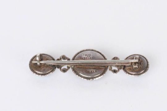 A silver bar brooch with three roundels of butterfly wings the graduated roundels containing turquoise butterfly wings, length 6cmCondition: