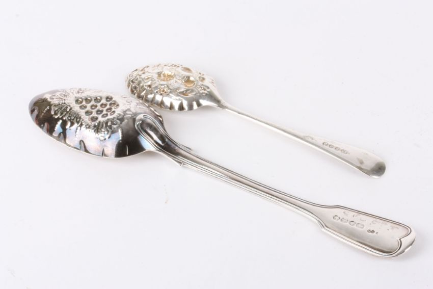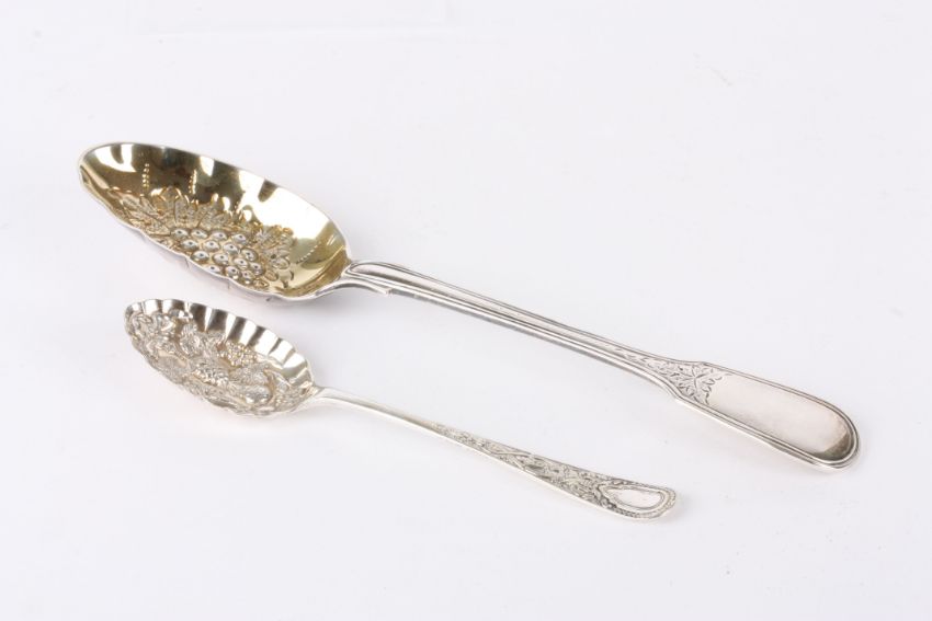 Two berry spoons the first larger spoon silver and hallmarked London 1864 the gilded bowl with fruit decoration, the second smaller silver plated preserve spoon, 2.5ozCondition: