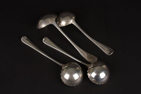 A pair of George III silver sauce ladles hallmarked Sheffield 1777, together with one other silver sauce ladle and one silver plated. (4), 6.8 ozt. Condition: Good condition.