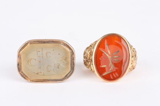 A 9ct gold hardstone seal ring together with a gold plated hardstone seal fob engraved with a shield. (2), Ring approx 6.9 grams.Condition: Wear to the corners of the fob mount, ring in reasonable condition.