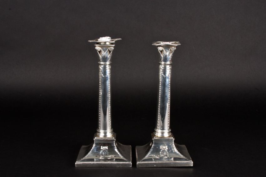 A pair of George V silver Corinthian column candlesticks hallmarked London 1915, with embossed ribbons, harebells and garlands, and supported on square tapered weighted bases. Maker: Thomas Bradbury & Sons., 23.5 cm high.Condition: Worn in general, few pinprick holds, no significant damage.