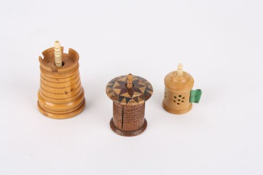 Three treen tape measures comprising one Tunbridgeware measure, another in the form of a turret, and one other with ivory winding handle (3) , height the largest 5cmCondition: In good overall original condition. With wear but no major damage.