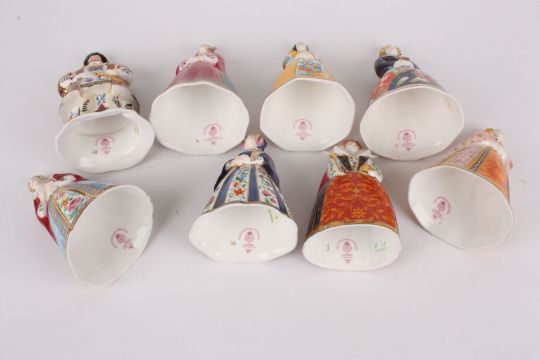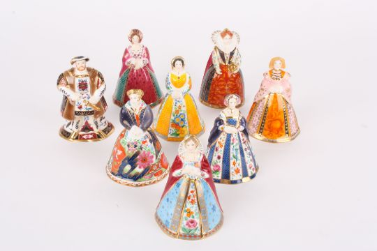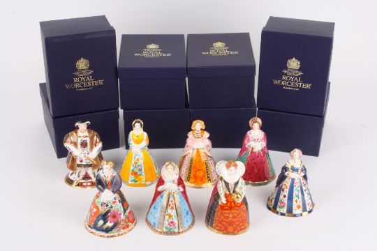 A set of eight Royal Worcester porcelain snuffers Catherine Parr, Jane Seymour, Elizabeth I, Anne of Cleves, Catherine Howard, Henry VIII Catherine of Aragon and Anne Boleyn. All in original boxes. (8), Condition: Generally good condition.