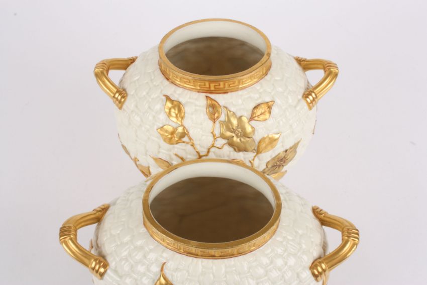 A large pair of Victorian Royal Worcester ovoid cream and gilt vases the basket weave bodies mounted with leaves and branches in relief, with twin gilt handles, and Greek key necks, and supported on naturalistic branch feet., 21 cm high.Condition: One with restoration to the feet, other vase appears in good condition.