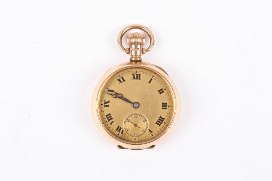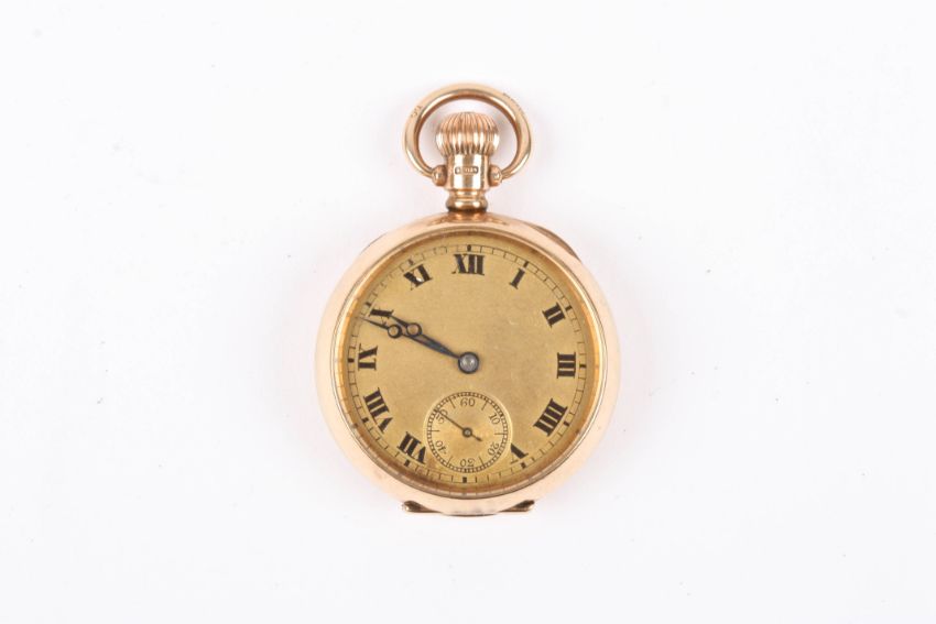 An early 20th century 9ct gold ladies fob watch hallmarked Birmingham 1920, with gilt dial and black Roman numerals, engraved monogram to case back., 31.8 grams total.Condition: In good condition, winds and sets, but only runs for a short period of time.