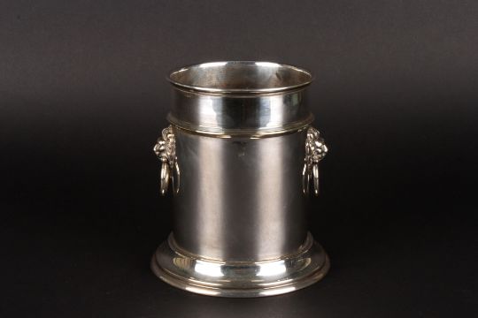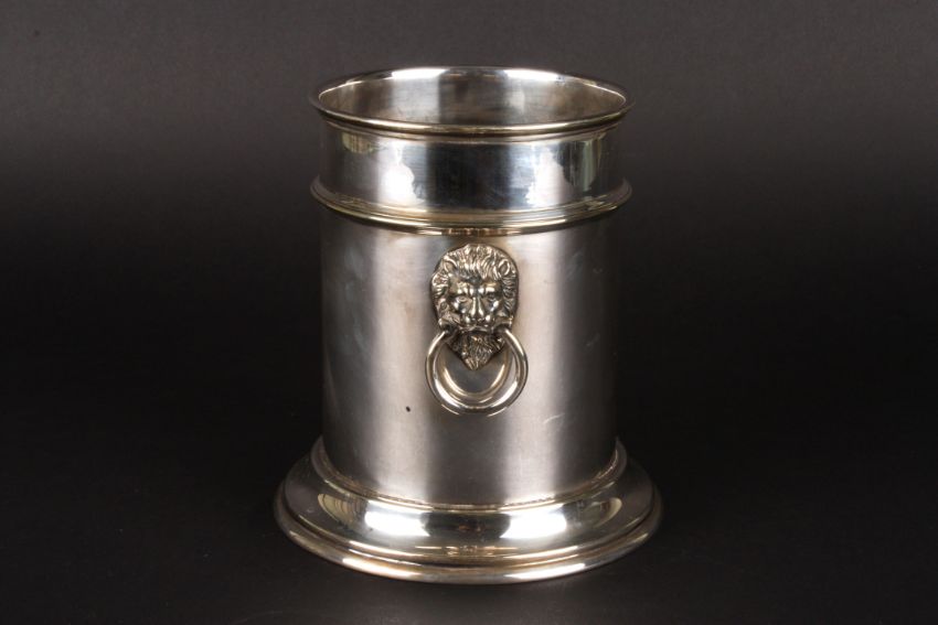 A silver plated wine bottle holder with twin lions head ring handles and supported on a circular foot., 16.5 cm high.Condition: Good condition.