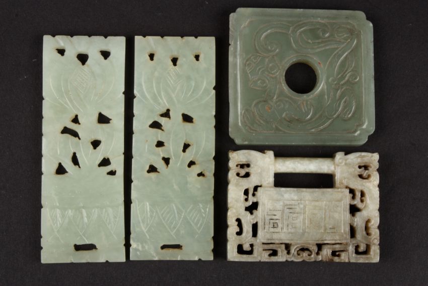 A Chinese 20th century carved square jade panel carved with a stylised dragon together with a pair of pierced pale green rectangular panels and a stylised rectangular hardstone carving in the form of a lock (4), Square measures 5.5cms acrossCondition: Square panel ground to one edge and possibly to back. First hand inspection suggested.