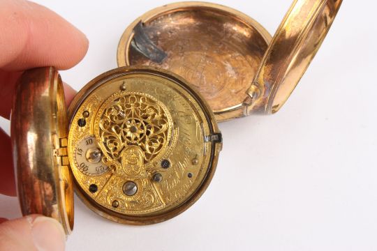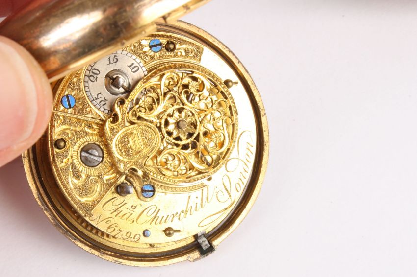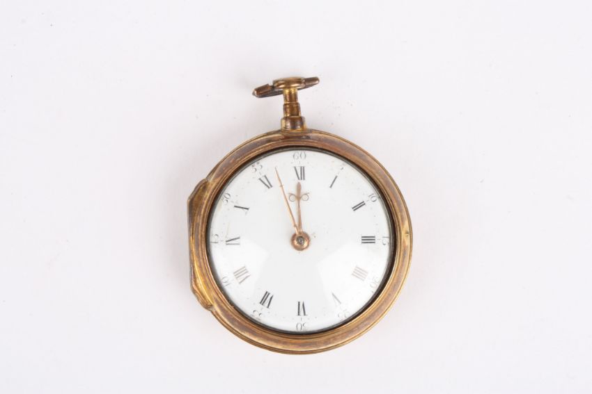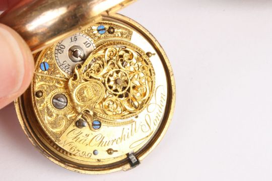 An 18th century pair cased fusee pocket watch by Charles Churchill of London, No. 6799, the white enamel dial with black Roman numerals., Condition: Appears in good working order, some tarnish to the case.