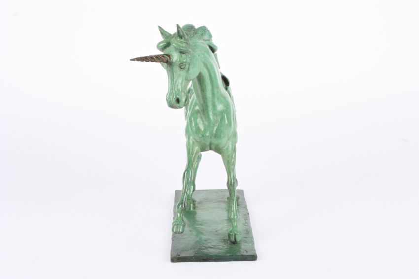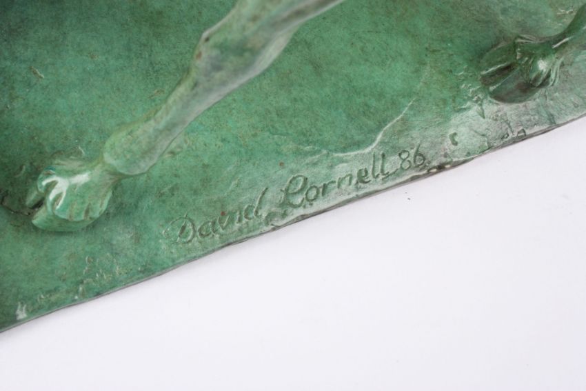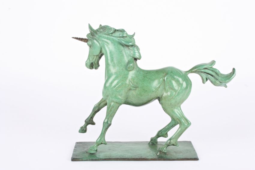 David Cornell (20th century) British A green patinated bronze model of a unicorn, limited edition 1/12, signed and dated 1986., 32 cm long.Condition: Good condition.