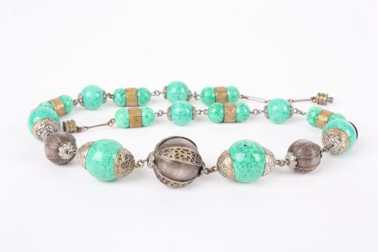 An unusual white metal and ceramic bead necklace the central white metal bead with filigree mounts, flanked by graduated green speckled ceramic beads., 47 cm long.Condition: Good condition.