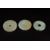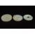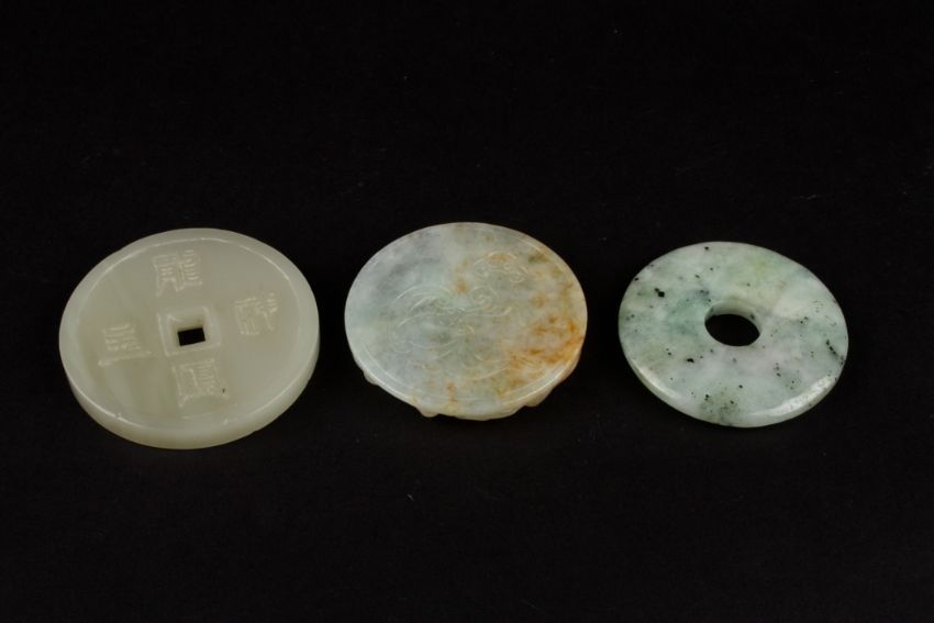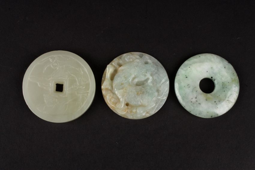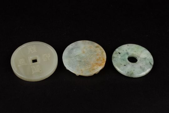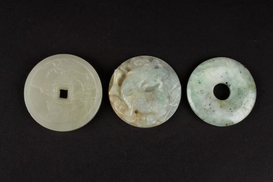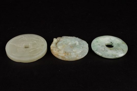 A Chinese 20th Century hardstone pendant of circular form carved in high relief with a dragon amongst scrolls, together with a Chinese pale green flecked hardstone bi, and a pale celadon hardstone roundel carved with mythical creatures and four Chinese characters to the reverse (3), Largest diameter 5.5 cmsCondition: No visible defect