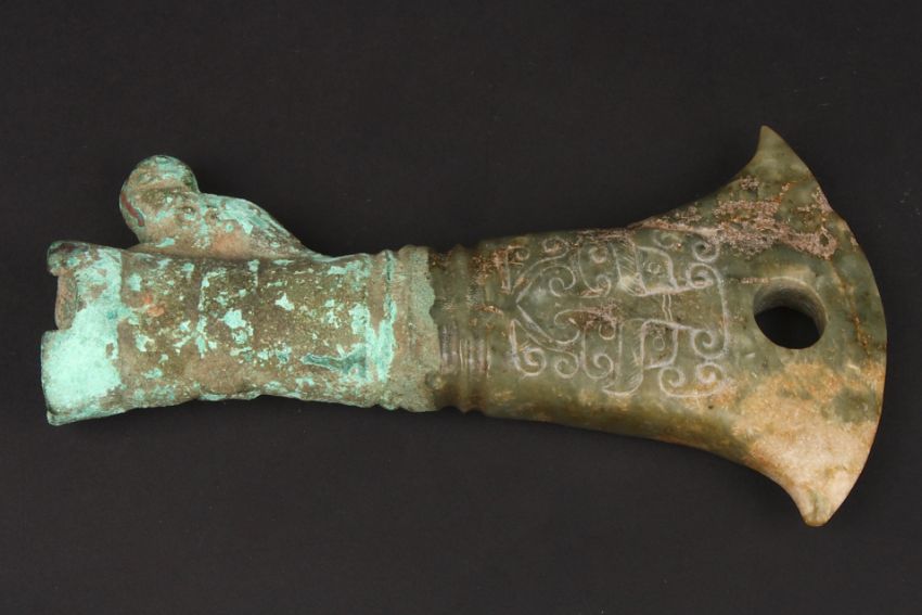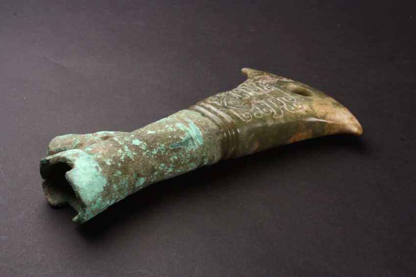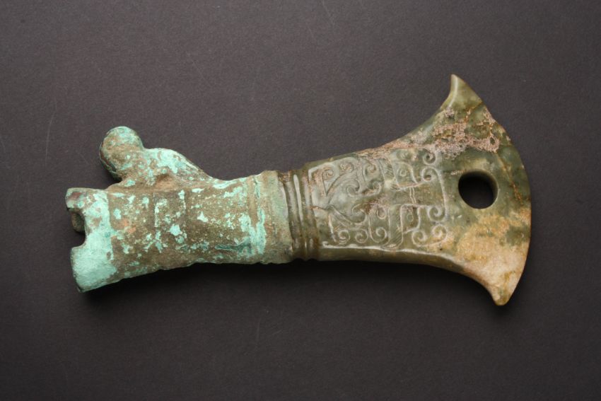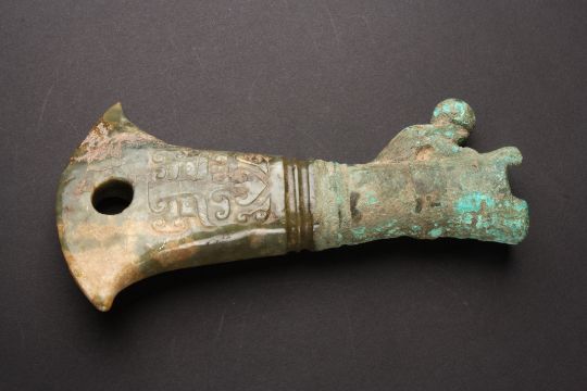 A carved jade axe head in archaic style the jade carved in low relief, with metal grip , length 20cmCondition: Wear with age. First hand inspection suggested.