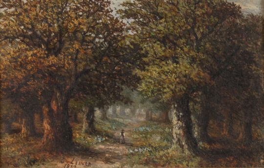 Charles Leaver (1824-1888) British A figure walking along a wooded path, oil on panel, signed and dated 1882, in a gilt frame., 10.25 x 16 cm.Condition: Few losses to frame, otherwise image in good condition.