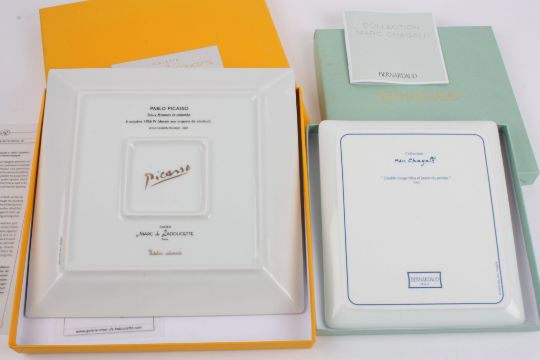 Two 20th century limited edition plates by Picasso and Chagall the Pablo Picasso plate by Galerie Marc de Ladoucette, entitled 'Deux femmes et Colombe', c.2003, the Marc Chagall plate by Bernardaud, entitled 'Double visage bleu de jaune du peintre'. Both in original fitted boxes. (2), Picasso 27 cm square, Chagall 22 x 19.5 cm.Condition: Good condition.