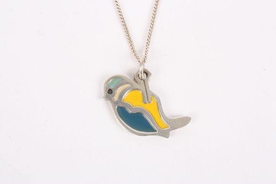 A contemporary silver and enamel blue tit pendant hallmarked Sheffield 1977, of stylised form, on a silver chain. Makers mark: EJC., 2.7 cm long.Condition: Good condition.