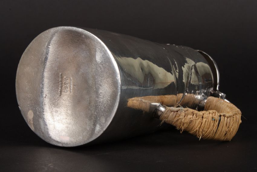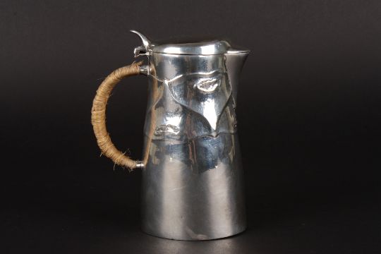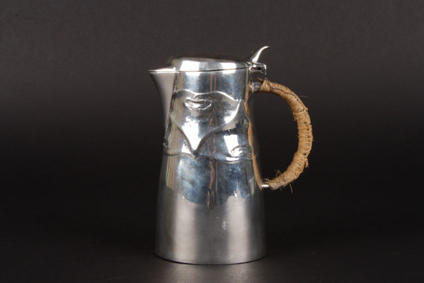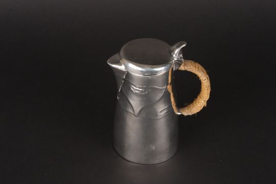 A Liberty Tudric silver plated cafe au lait pot, designed by Archibald Knox with moulded foliate decoration and wrapped handle, stamped Tudric and numbered: Rd. No. 421106 0278 4., 14.75 cm high.Condition: Generally good condition, wrapping to handle possibly replaced, few small marks.