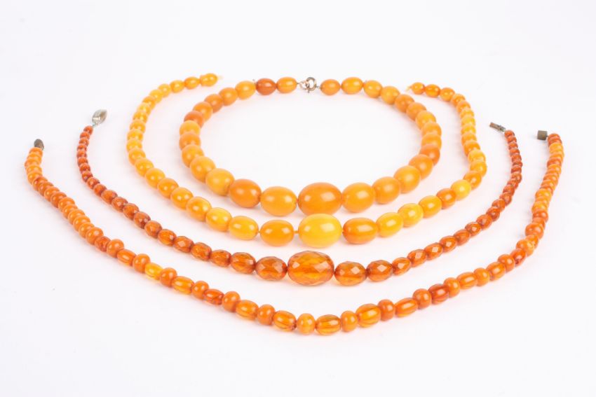 Three natural Baltic butterscotch amber necklaces, two of oval, polished and graduated beads, one of even size beads mixed with clear amber beads (and a clear facetted string of amber beads (4), Condition: One fastening a.f.
