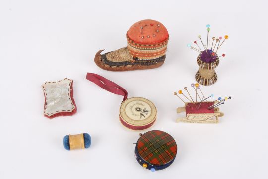 A collection of seven Victorian and later pin cushions including one bone example in the form of a wheel barrow, another mother-of-pearl, one tartan ware and four others, Condition: Various conditions and with some ware