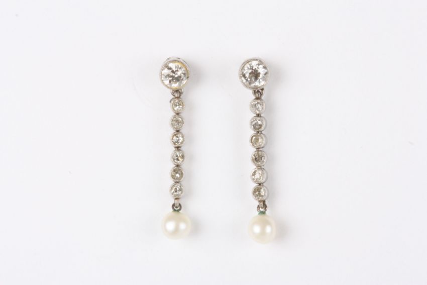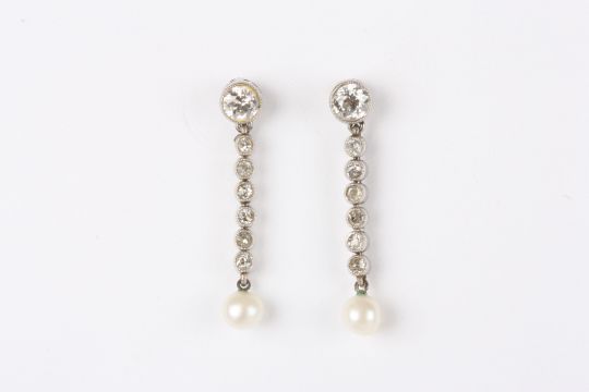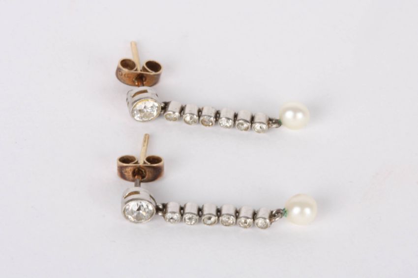 A pair of diamond and pearl drop earrings with butterfly backs , overall length 2.5cmCondition: