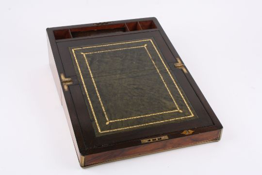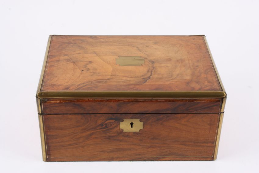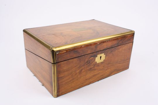 A Victorian figured walnut writing box with brass bound edges and cartouche, and fitted interior., 35 cm wide.Condition: Split to front.