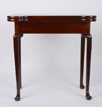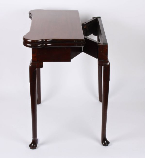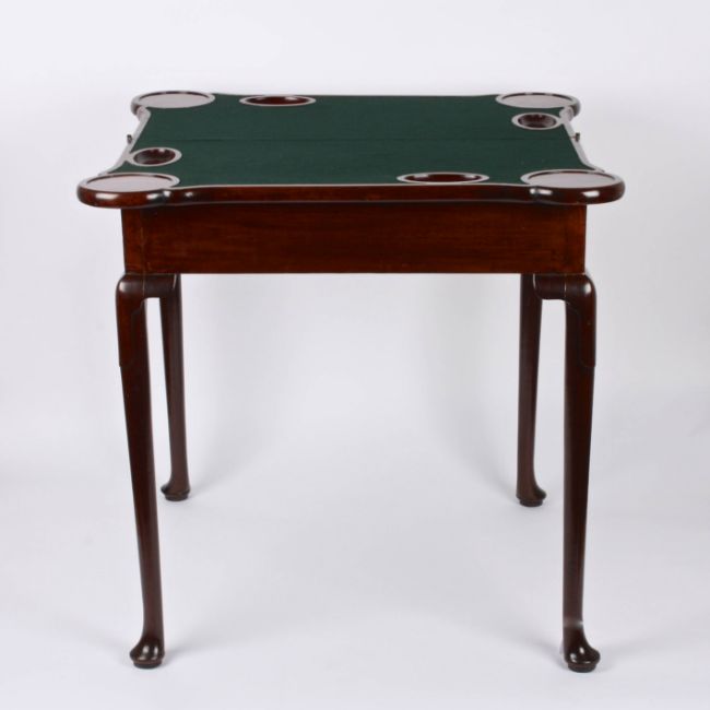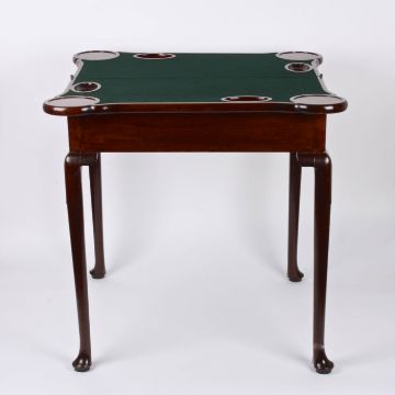 A George II mahogany foldover card table the shaped top opening to reveal circular carved trays and counter wells, with green baize lining, supported on cabriole legs., 73.5 cm wide.Condition: One leg restored, baize replaced.