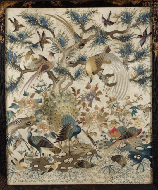 A Chinese silk embroidered panel worked in different coloured silks depicting a tree with numerous birds including peacocks realistically illustrated some in flight and some resting, mounted in a wooden frame with Chinoiserie design , 46.5 x 39cmCondition: Slight staining to background but overall in good condition