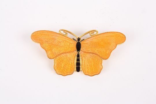A Swedish guilloche enamel brooch in the form of a butterfly the engine turned yellow enamel wings realistically decorated, the reverse stamped Sweden, width 5cmCondition: The enamel in very good condition. Pin in good condition.