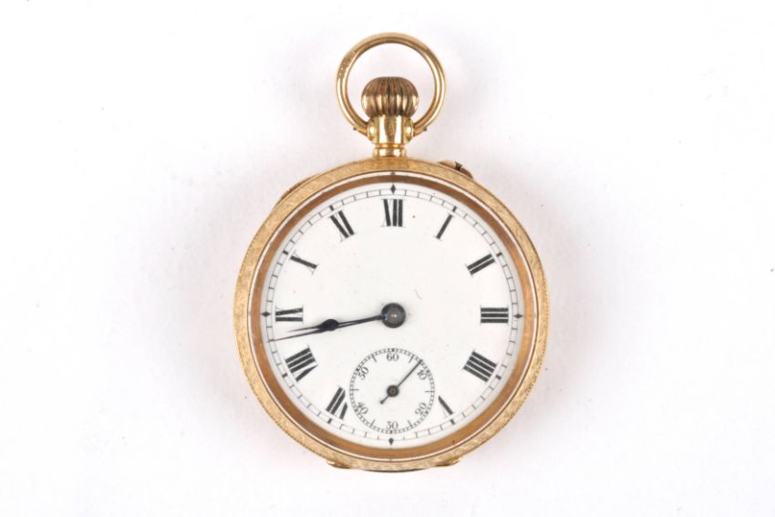 An early 20th century 18ct gold ladies fob watch import mark for London 1911, with white enamel dial, Roman numerals and subsidiary seconds dial, unsigned within an engraved foliate case., 25.5 grams total.Condition: Appears to be in working order, some case wear, but no damage.