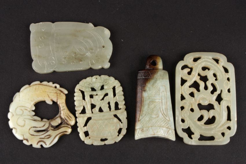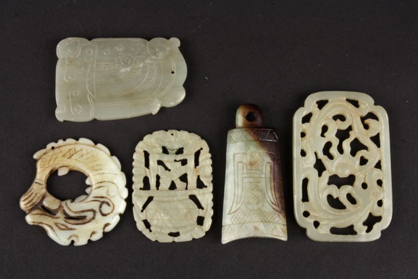 Four 20th century Chinese hardstone carved plaques including a stylised celadon scroll pendant, a pierced dragon plaque, another smaller and two other hardstone items (5), Largest measures 7cms widthCondition: No visible defects. First hand inspection suggested