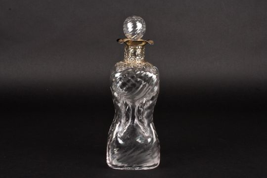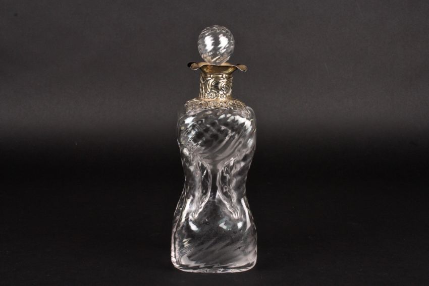 An Edwardian silver mounted glass decanter and stopper hallmarked London 1907, with wrythen pinched glass body and reticulated silver mounts. Maker: William Comyns., 25.5 cm high.Condition: Good condition with no damage.