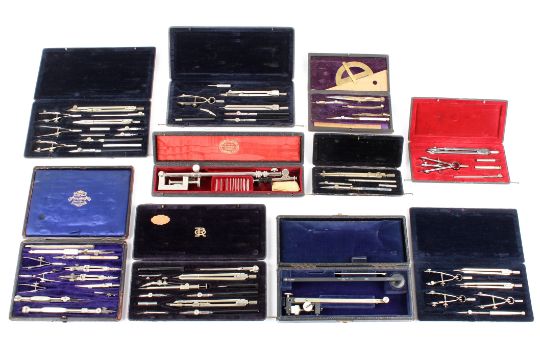 Another similar collection of ten assorted drawing instrument sets 20th century predominantly contained within black leather style covered cases, including a camera lucida in fitted case by Lechertier Barbe Ltd, together with a number of other sets of drawing instruments mainly compasses, pens and dividers, width of the former case 28cmCondition: The camera lucida missing one lens otherwise in very good original condition and with instructions. Many of the cases in average condition mostly complete, some missing one or two instruments. Overall a good to fair collection.