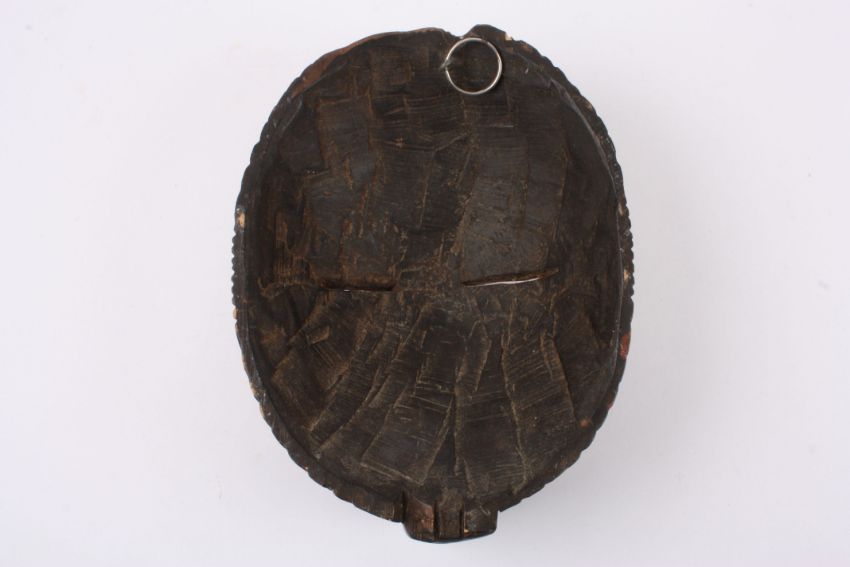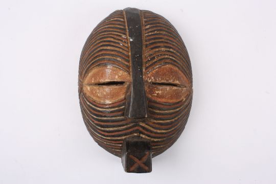 An early 20th century African tribal carved wooden mask with stylised slitted eyes, the whole face with carved and painted line decoration and block mouth., 27 cm long.Condition: Good condition.