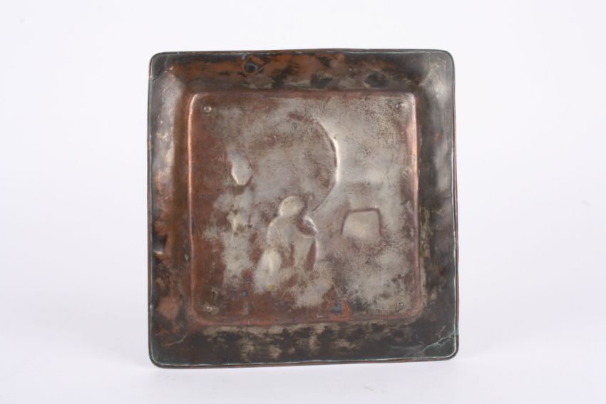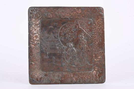 An early 20th century Japanese copper plated relief tray decorated with two Japanese woman and a garden scene with pagoda, the rim decorated with flowers., 17.5 cm square.Condition: General ware across the whole surface.