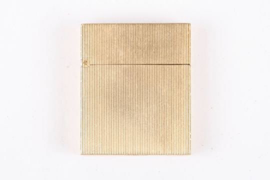 A Goldsmiths & Silversmiths 9ct gold engine turned cigarette lighter hallmarked London 1948, with flip top lid, engraved makers name., 39 x 33 x 9 mm. 34.3 grams.Condition: Generally good working order, not able to test, but striker works and lid action snaps shut crisply.