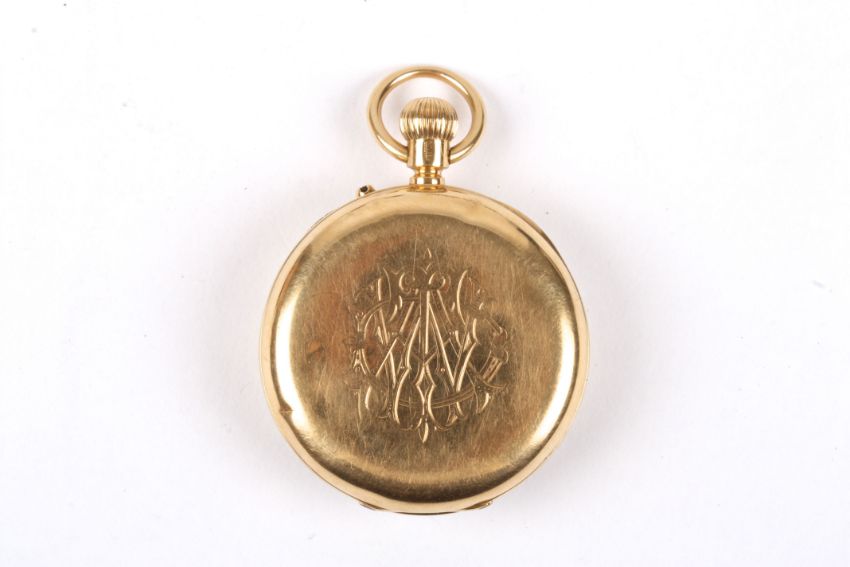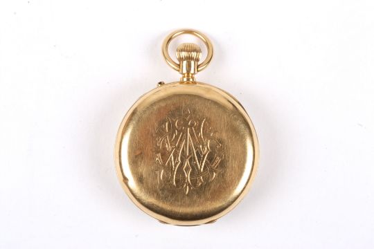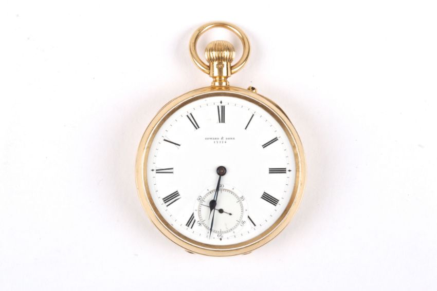 A Victorian 18ct gold open face pocket watch by Edward & Sons hallmarked London 1881, the white enamel dial signed and numbered 17174, with black Roman numerals and subsidiary seconds dial, with engraved monogram to case back, the three quarter plate engraved Geo. Edward & Sons, Makers to the Admiralty, 1 Poultry, London, 92 Buchanan St. Glasgow, 17174., 104.3 grams total.Condition: Appears in good working condition, some surface wear.