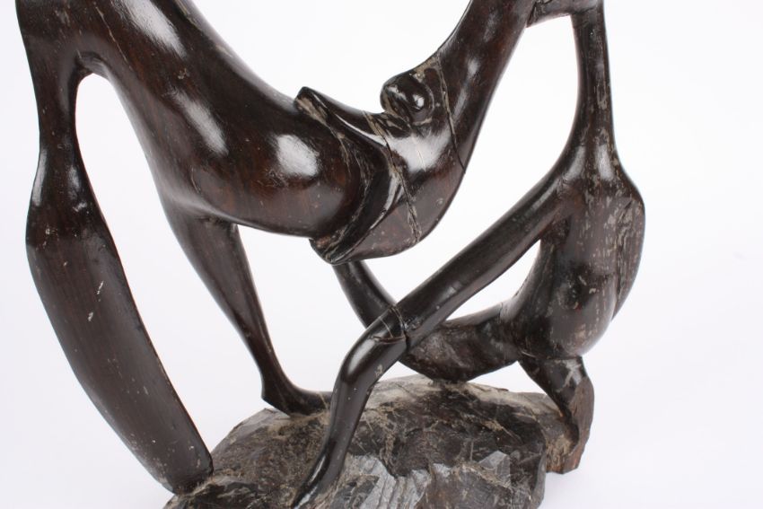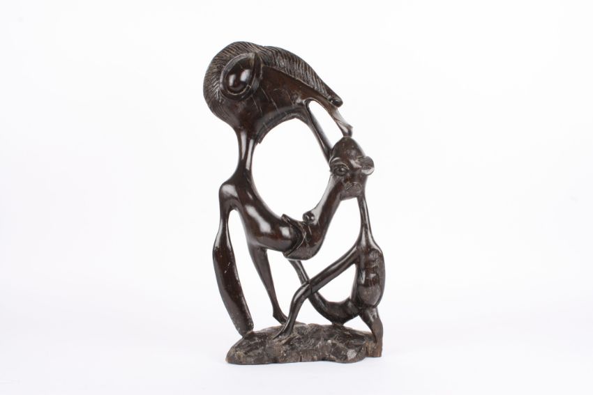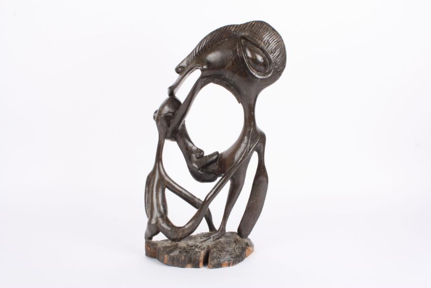 A Tribal African wooden carving of a mother feeding child late 19th, early 20th Century, height 48cm., width of base 23cmCondition: Some breaks and restoration specifically above the child's nose and limb