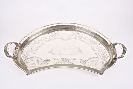 A large American silver plated two handled fan-shaped butlers tray the centre engraved with a central classical scene, surrounded by Aesthetic leaves and birds, with heavy scrolled handles, makers mark: Hiscox Silver Plate Co., Meriden, Connecticut. , 82.5 cm wide.Condition: Heavy ware to the central panel, otherwise good condition, possibly re-plated.